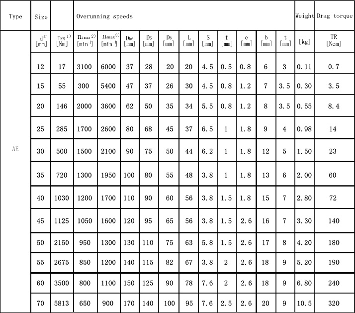 AE系列是沒行軸承支撐的滾柱型單問離合器。使用時需要有軸承來承受徑向及軸向載荷,并且要存潤滑及密封。